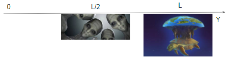 1. Где-то в глубине космоса происходит некое событие, в результате которого появляется 2 (два) фотона света. Возникший луч света (а свет, как мы знаем, всегда распространяется по прямой) оказывается направлен прямо на Землю, которая находится на расстоянии L. Направление луча примем за ось Y. Посередине этого пути один фотон попадает в мерзкие скользкие холодные серые лапы пришельцев и они забирают его на опыты. А другой фотон долетает до Земли и оказывается в тёплых заботливых белых (неполиткорректно!) чёрных руках астрофизика для дальнейшего изучения: