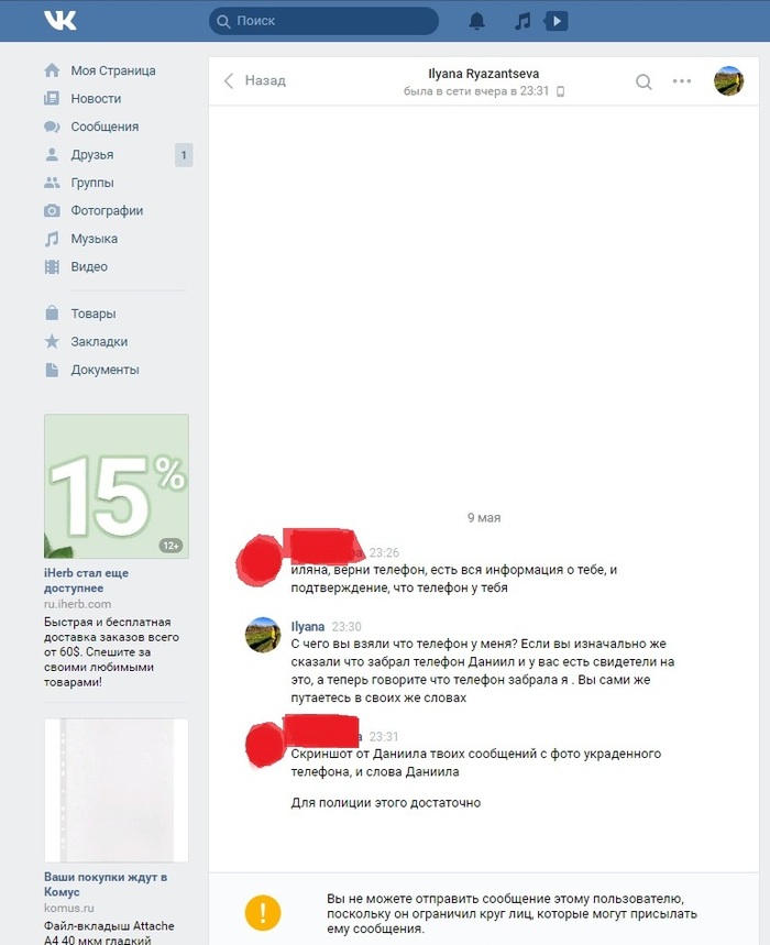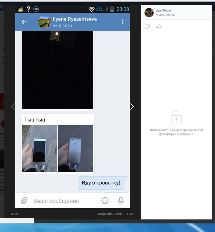 Уже сидя в отделении, мы снова получаем звонок от родителей, которые описывают нам пропавший телефон, сообщают что телефон находится у девушки и скидывают скриншот с изображением телефона из переписки их сына с той девушкой. Они дают нам ее контакты, на звонки и смс она естественно не отвечает, но при этом пытается оправдываться вконтактике.