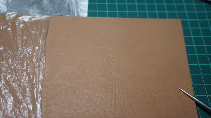 Я пользуюсь или целофановым пакетом, или стретч пленкой, накрывая нерабочий участок, который сохраняет влагу. Кто-то кожу перед тиснением не готовит, а просто пшикает с пулика, или смачивает губкой. Ну, как вариант для неглубокой мелочи мб, но для серьезного проекта не канает, кмк. К тому же, ежели вы сделали часть тиснения, кожа высохла, а вам надо продолжать, то смочив заново тисненные участки кожа поведет себя как губка, несколько выровняв и смазав тиснение.