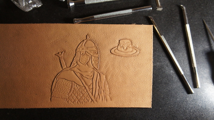 Так как масштаб изделия большой, даже не так, объем тиснения большой, Вы не успеете зафигачить всё до того, как кожа высохнет, даже если вы начали с полусырой кожины.