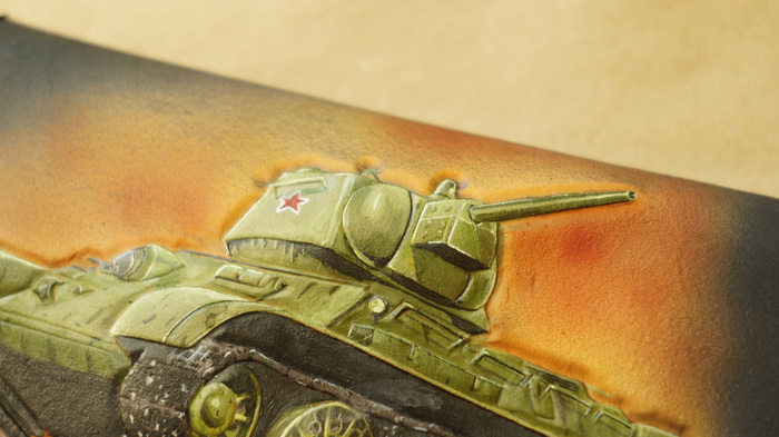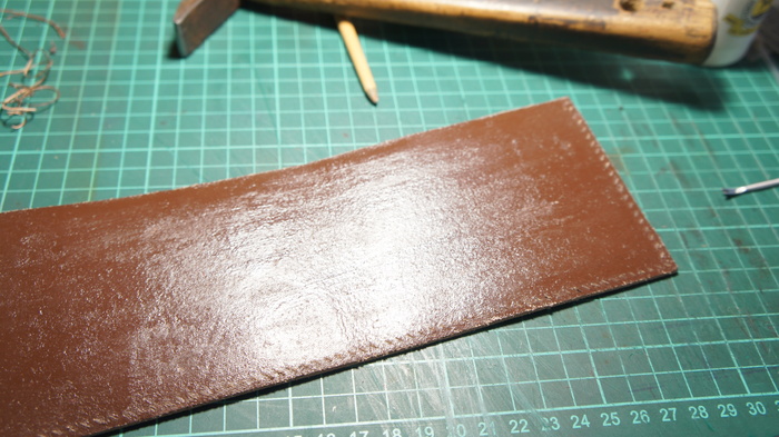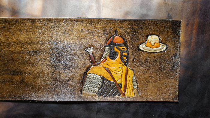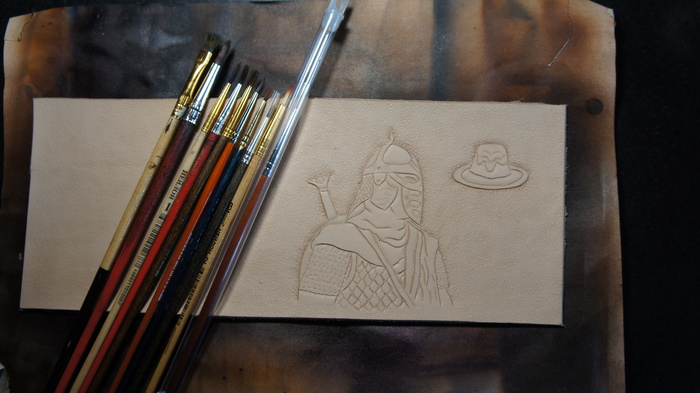 Возвращаясь к предыдущему этапу, после сушки заготовку немного покоробит, но страшиться не надо. Теперь приступаю к окраске. Весь мой опыт художественной школы благополучно похерен, поэтому не о каких сложных рисунках речи не идет, благо на данном изделии ничего такого не требуется, несколько базовых цветов и всё. Под конец заливаем копытным маслом и оставляем на пару суток напитываться и релаксировать. Масло восстановит коллагены и жиры, утраченные кожей при тиснении и покраске спиртовыми красками, проще говоря, вернёт всё д.рьмо, которое мы вышибли из заготовки.