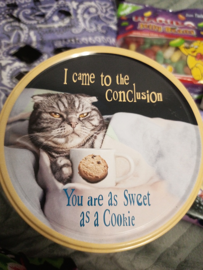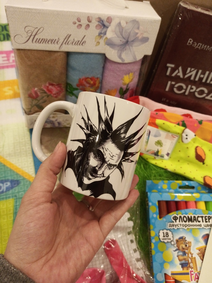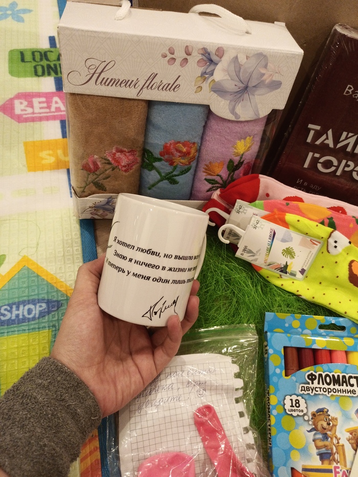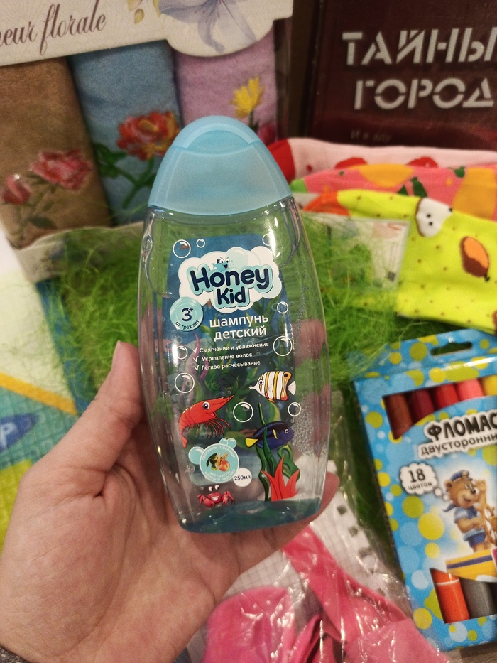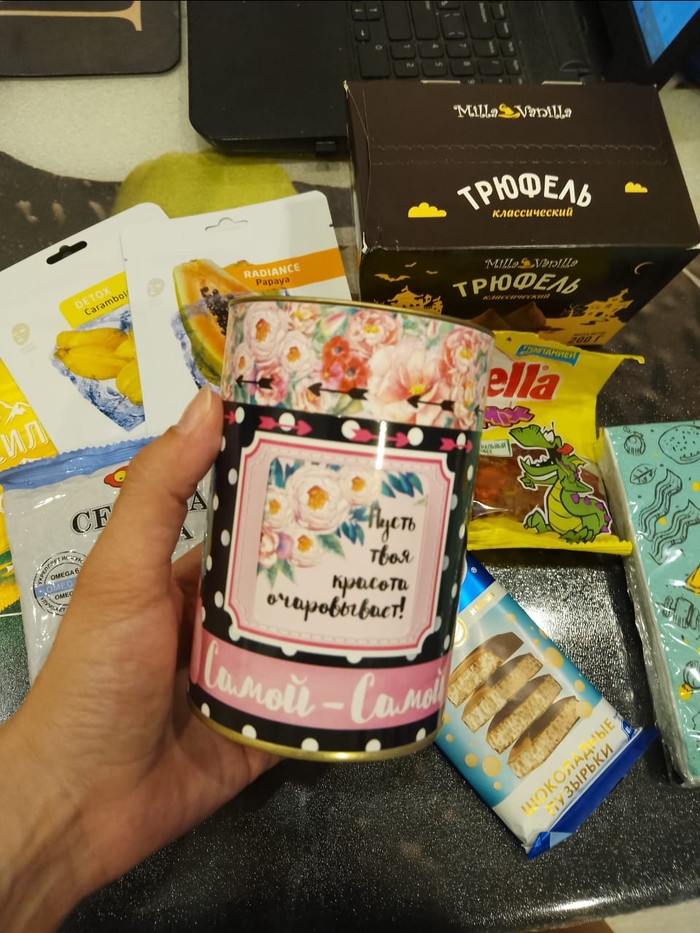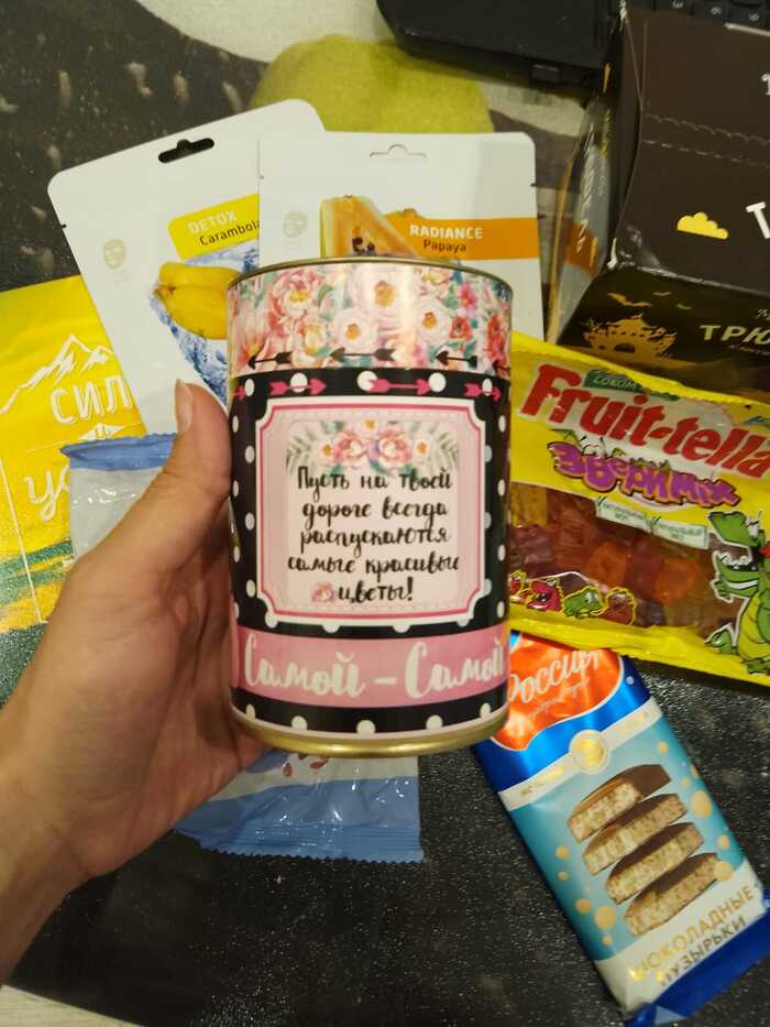 Здесь семена льна и забавные салфетки для худеющих, трюфели, молочный шоколад и мармимишки для сладкоежек, милый горячий шоколад в банке с пожеланиями, масочки для лица фруктовые и открытка с теплым приветом отправительницы.