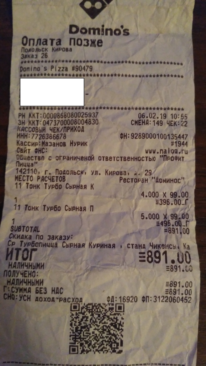 Добрый вечер уважаемые пикабушнки. Решил написать пост, о том, как по акции купил "пиццу" в доминосе. 06.02.2019 пришла мне смска, что в этот день будет проходить акция, новые две пиццы всего за 99 р, зайдя на сайт действительно акция будет с 10 до 12 и только на вынос. Однажды я попадал на такую акцию почти год назад, особо не рассчитывал на добротную пиццу, но она тогда оказалась хорошей, ингредиентов было много, все мои коллеги по работе остались довольны. Время идет, все меняется, доминос это тоже не обошло стороной, к сожалению не в лучшею сторону. Забрав пиццу, я привез ее на работу в количестве 9 штук, после того, как мы ее открыли, мы поняли, там одно тесто, сверху присыпано не много сыра и есть пару кусочков курицы, к примеру как из пакетика доширака. Честно не ожидал, что такая крупная сеть опустится до такого уровня, но урок сделал на будущее, попутно написав отзыв на ихнем сайте. На следующий день мне перезвонили, сказали, что это акция и количество ингредиентов уменьшено, в качестве компенсации готовы привезти вам пиццу. Конечно, одна пицца на 7 это капля в море, но согласился, звонок был в четверг, обещали привезти в пятницу, даже уточнили время до которого часу, сегодня уже среда, видимо готовят нереально огромную пиццу, для которой нужен самосвал:-)) Поэтому не видитесь на акции, вы получите одно тесто, за свои слова не отвечают, позвонили для галочки... Пруфы прилагаю, в пакете кусок лежит как вещь док, желающие могут посмотреть лично)))
