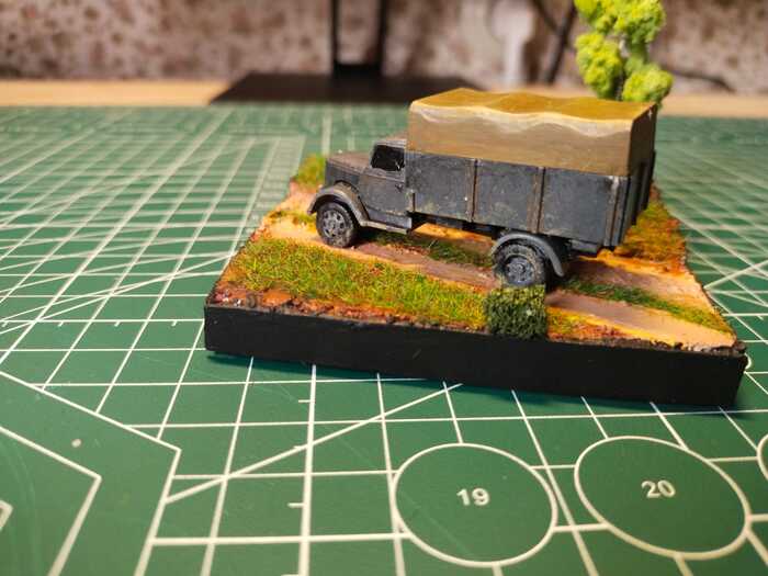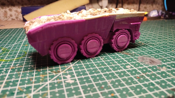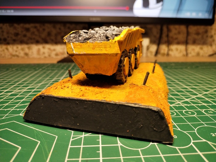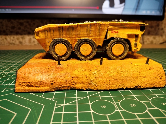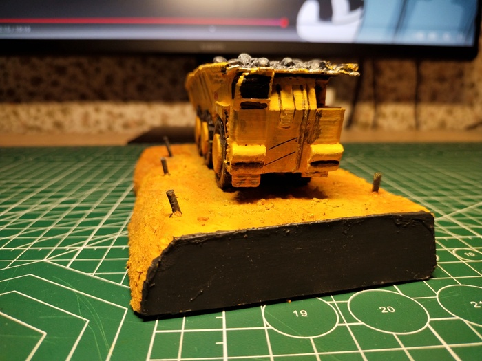 Начал я с подставки. Из пеноплекса быстренько задал базовые очертания, а из само застывающей смеси вылепил правдеподобные скалы. Текстуру камня предавал (Нет не камнем) губкой и кистью. Получилось даже прикольно. До этого много работал с этой смесью, и знал что если много воды использовать при лепке, то она не трескается...вроде. Окантовку диорамы сделал из какого-то тонкого пеноплекса, материал интересный надо ещё где-нибудь использовать. На этом этапе я забросил проект на пару недель. И вот когда я к нему вернулся...Глина предательски потрескалась. Если кто знает как избежать трещин, напишите пожалуйста в комментариях. Ну а я прошёлся по всем трещинам текстурной пастой. И вот пришёл этап покраски. Вначале всё покрасил в чёрный и затем, потихоньку высветлял голубовато-серым (ну и конечно я забыл сфоткать итоговый вариант цвета подставки...так что теперь только в собранном виде и рассматривать).
