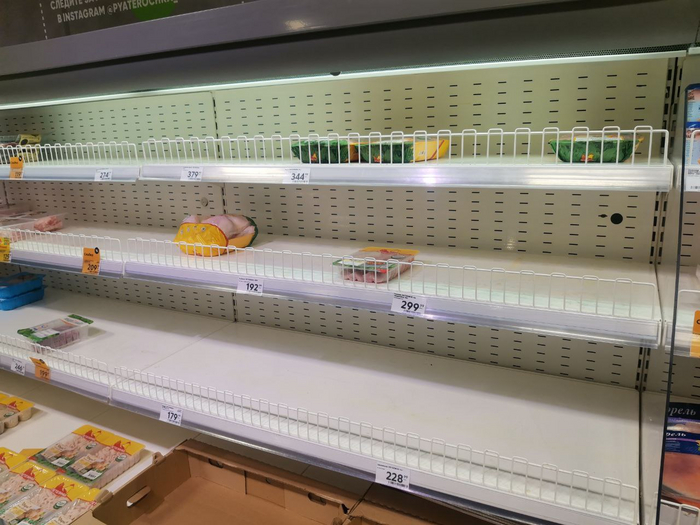 ✔Разумеется, началась паника среди населения, вызванная самим населением. С полок пропала гречка, курица, дешевые макароны, бич-пакеты, соль-сахар и, разумеется, туалетная бумага.