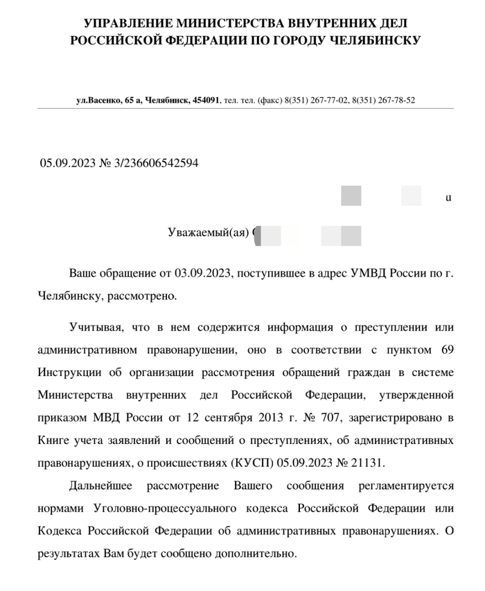 Уххх, думаю, щас я проявлю свою гражданскую позицию, пусть его накажут, тут как минимум пересечение двойной сплошной и проезд на красный. Скинул видео и написал обращение в ГИБДД, через пару дней пришел ответ с присвоенным КУСП.