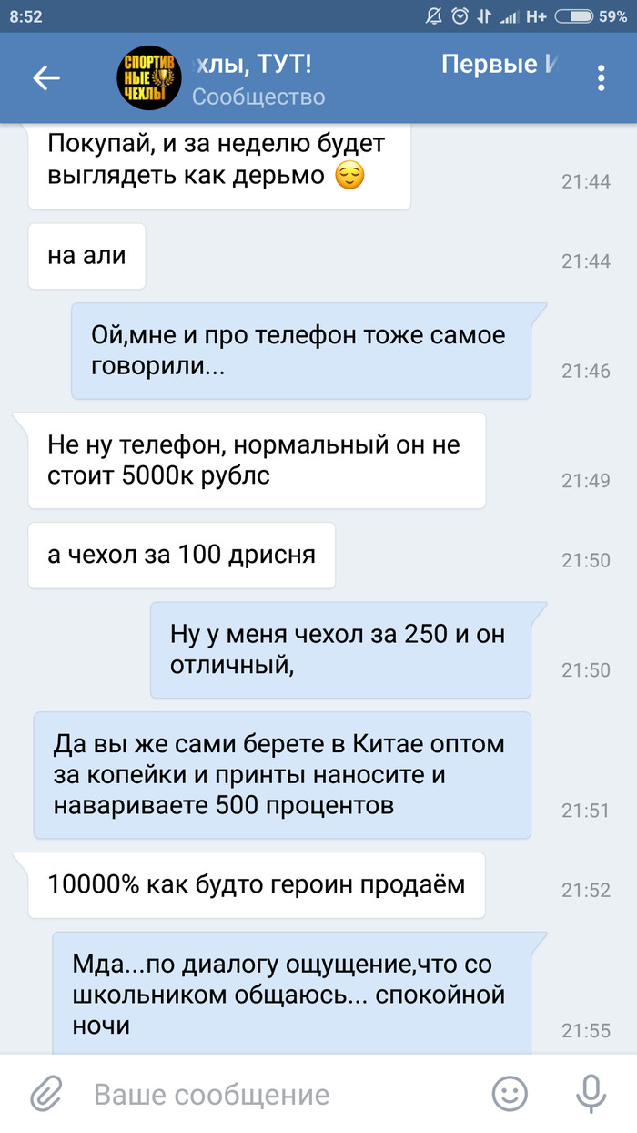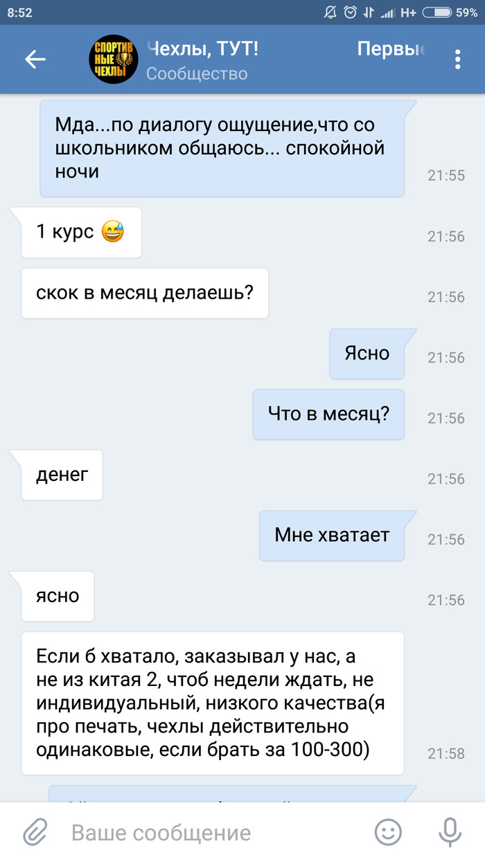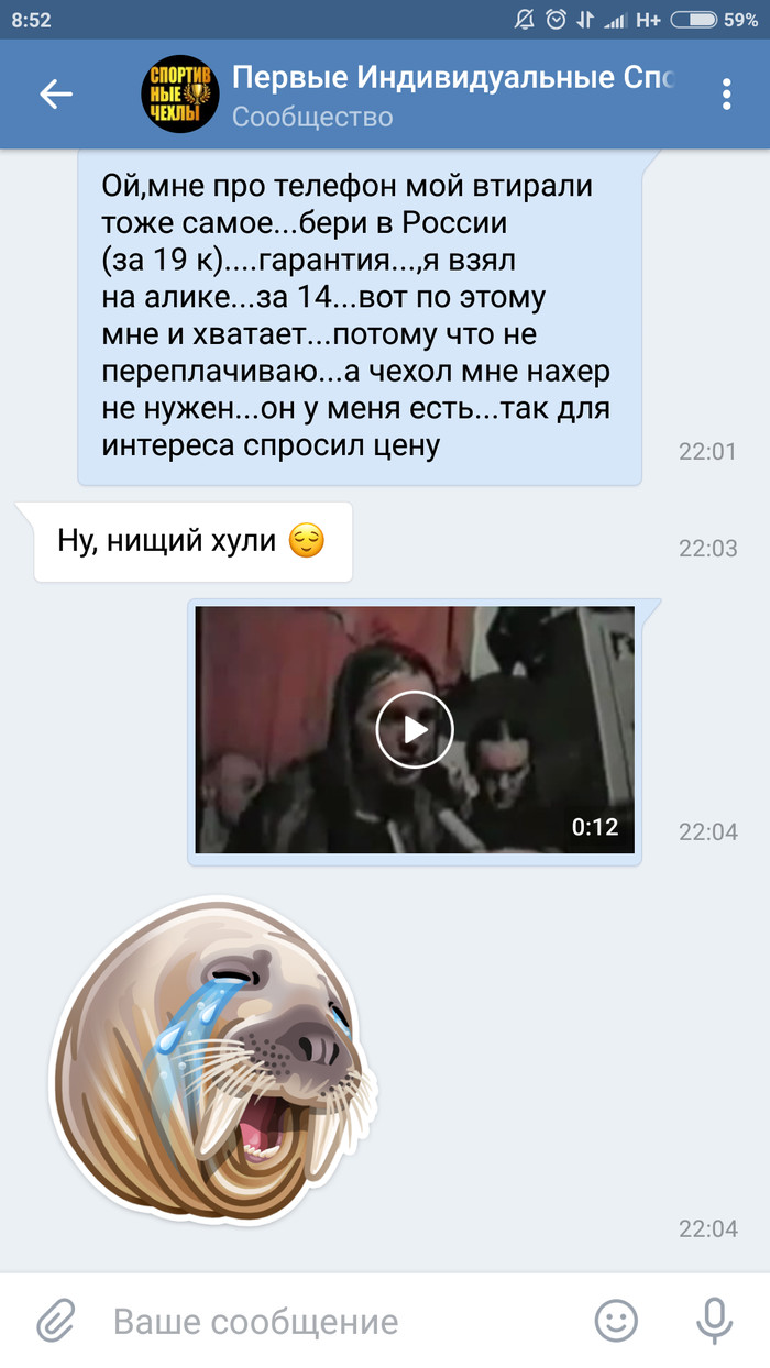Inpost Клиентоориентированность 7 лет назад Случайно наткнулся на чехлы в ВК,решил узнать стоимость,и вот такой неадекватный продавец мне попался Как можно продавцу оскорблять потенциальных покупателей? Показать полностью 7 [моё] Переписка Неадекват Продавец Длиннопост