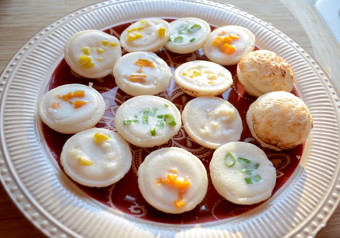 Похоже на оладьи. Делаются из рисовой муки, молодых (незрелых) кокосов, сахара, кокосового молока и яиц. Встречается кханом бабин в основном в центральной части страны, хотя у нас на севере я тоже иногда вижу. Вкус обычно сладковатый, но не слишком сладкий, а сам оладушек на удивление не жирный.