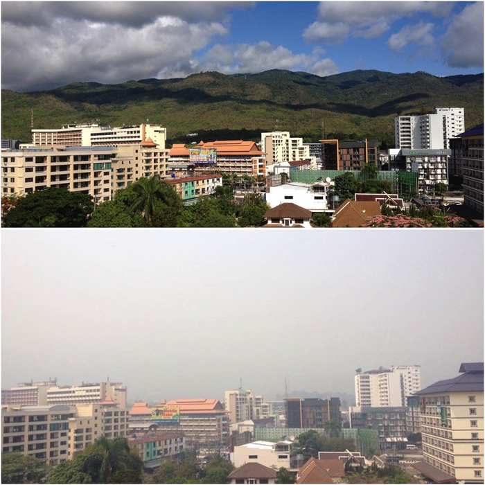 Живу в Чиангмае, северной столице Таиланда, уже давно. Чиангмай я обожаю и, скорее всего, никуда отсюда не перееду в будущем. Недавно я уже писал пост о том, что мне тут не нравится, и упомянул в нём "дымный сезон". За этим словосочетанием скрывается настоящий ад, который обрушивается на нас каждый год. Вот вам две фотки, сделанные из моего дома. Одна сделана в нормальный сезон с чистым воздухом, другая - в дымный сезон, причём ещё до его пика:
