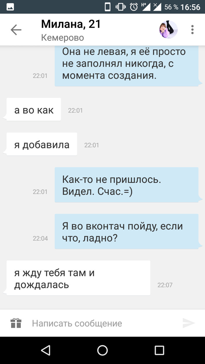 И вот вроде-бы ничего так, делаем как почти взрослые люди, общаемся, присылаем смешные фото друг другу(на самом деле я надеюсь, что будет продолжение и говорю непристойные взрослые слова)... но тут! вот сейчас самое интересное будет.