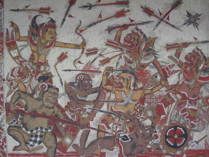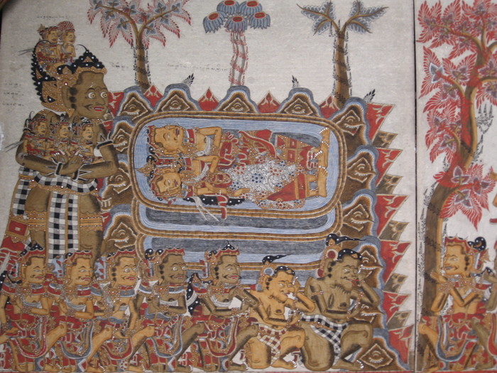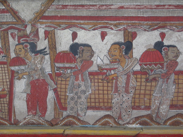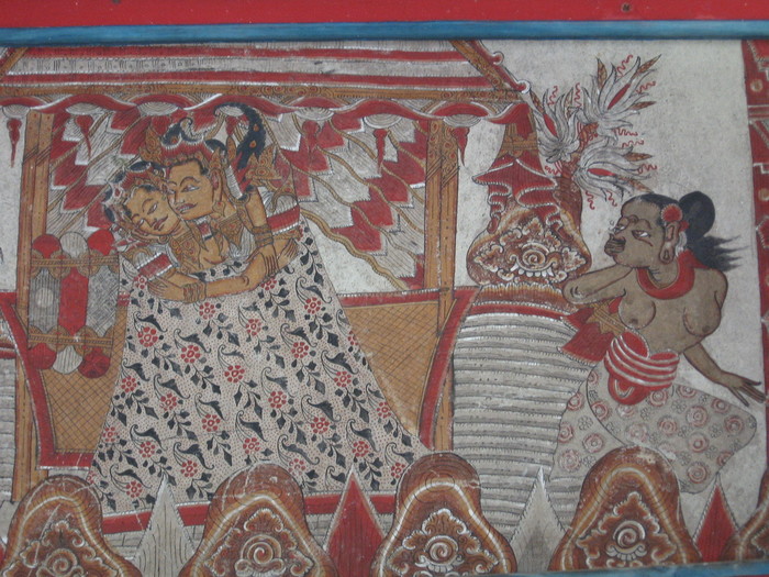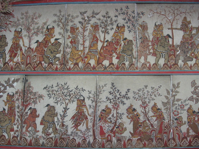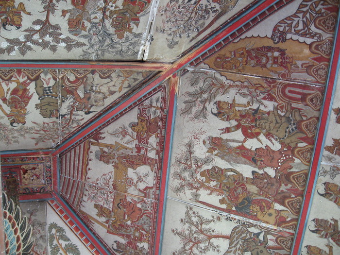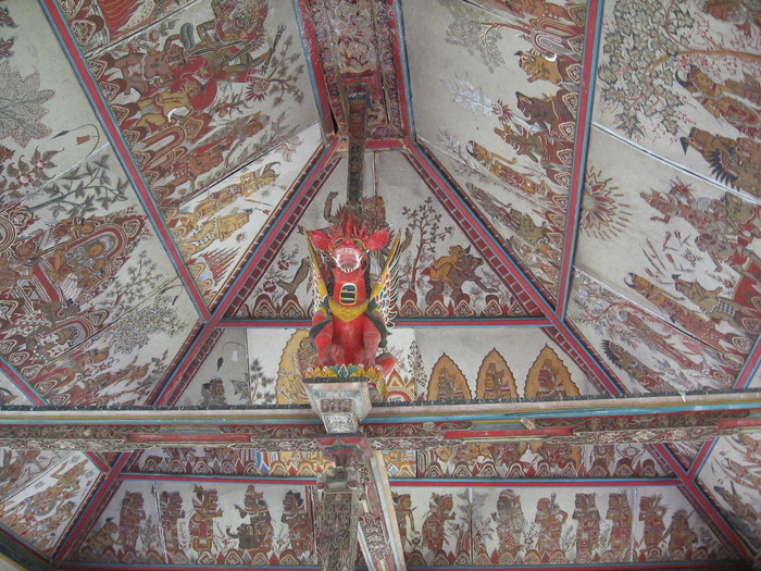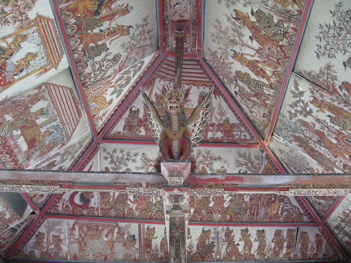 Это уникальные фрески стиля камасан, который так же называют «ваянг» (от названия традиционного кукольного театра теней, так как фигуры фресок изображены в форме фигур кукол). Развивался стиль камасан мастерами, жившими в деревне под этим названием, находящейся в регентстве Клунгкунг.