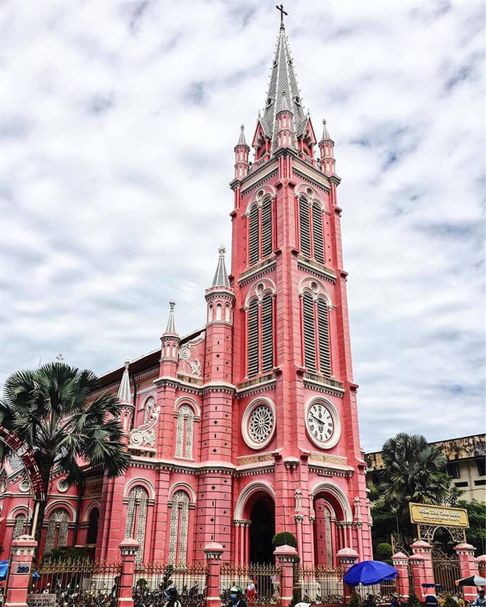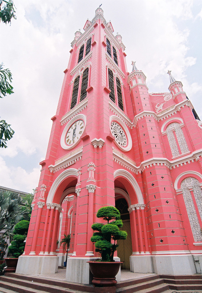В центре города Хошимин находится прекраснейшая церковь Тандинь, архитектура которой выполнена в готическом стиле, но при этом нет готической мрачности, потому что фасады выкрашены в яркий нежно розовый цвет, создавая ощущение декоративной воздушности, простора, легкости.