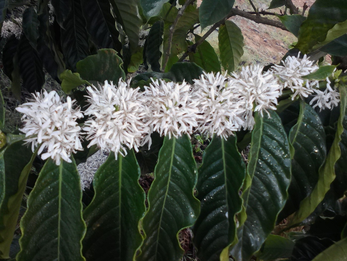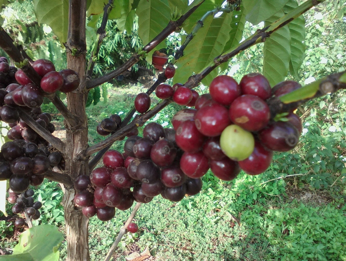 Здесь можно увидеть и цветы, и плоды (ягоды) кофейного дерева.