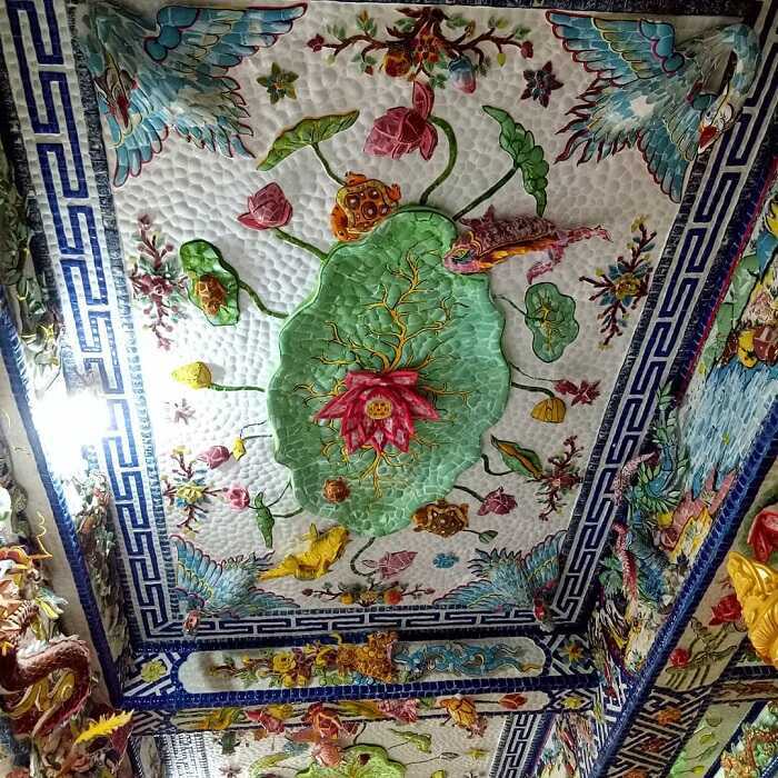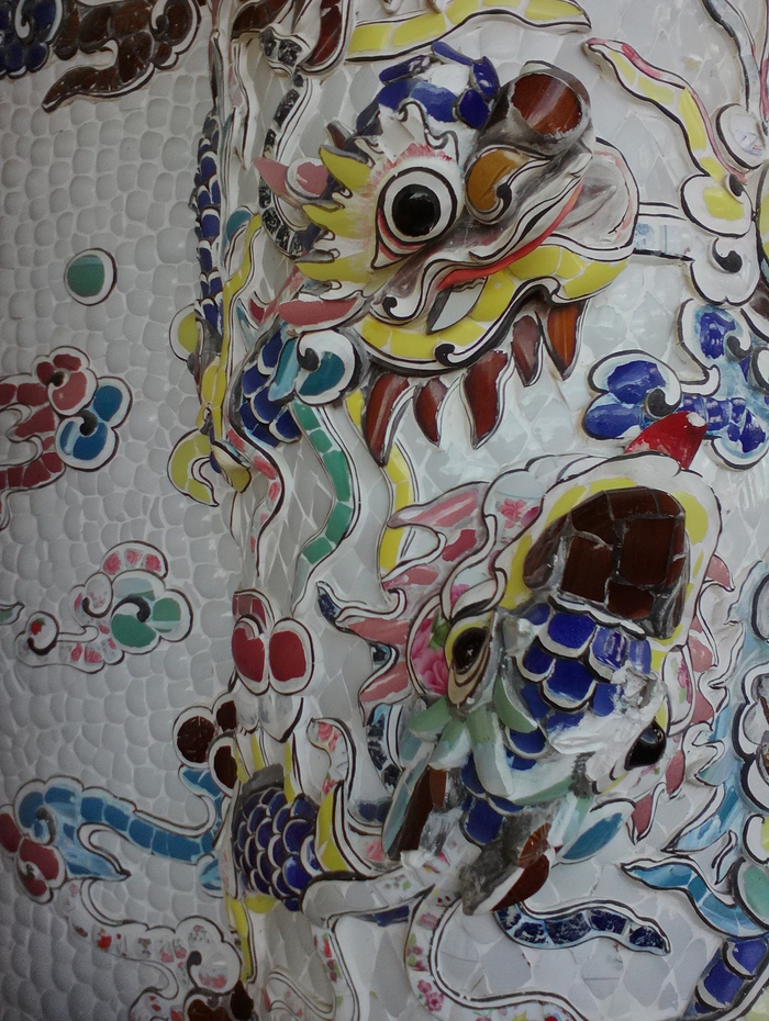 Перед входом в храм – огромный дракон, высотой 49 м, полностью сделанный из этой оригинальной майолики. Колонны как на фасаде, так и внутри храма, украшены изображениями фигур драконов. Небывалое по красоте декоративное оформление создают мозаичные орнаменты, ковром покрывающие фасад пагоды. Здесь проявилось всё многообразие фантазии местных мастеров, многие мотивы сделаны в стиле XIX в.