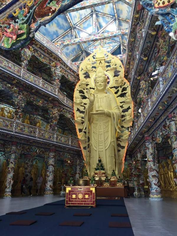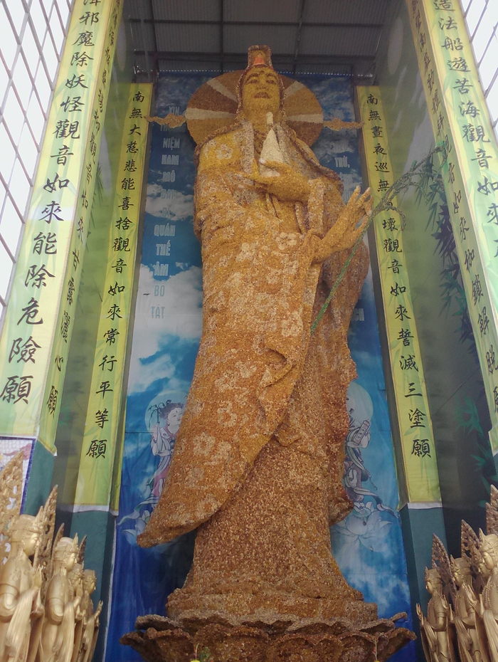 Перед храмом в специальном павильоне во дворе находится подлинное чудо, статуя, аналога которой нет нигде в мире, - это статуя бодхисатвы Куан Ам, 18 м. в высоту, сделанная из сушеных цветочков бессмертника.
