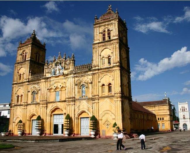 Строительство храма началось в 1866, практически сразу после подписания договора между императором Ты Дык и французами о разрешении исповедовать и проповедовать христианство. Церковь строилась в несколько этапов, первое здание было завершено в 1881 г, значительно перестроили в 1923 г, но в 1929 г. оно было разрушено штормом. Тогда в 1933 г. здание было отстроено в том виде, в каком мы видим его сейчас. Высота базилики 30 м., по бокам - две колокольни, каждая из них содержит 4 крупных колокола. Перед церковью площадь с двумя памятниками. Слева могила 83 мучеников, 15 м. в высоту. Справа – колонна со статуей святого Доминика.