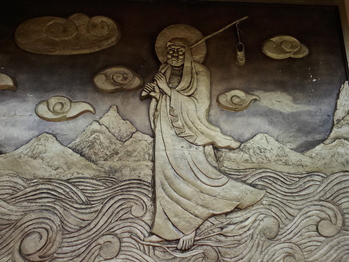 На бронзовом рельефе изображён легендарный основатель школы дзен-буддизма, а заодно и знаменитого монастыря Шаолинь, по имени Бодхидхарма. Этот проповедник буддизма пришёл из Индии в Китай в VI в и основал буддийскую общину, в которой и развил своё учение, впоследствии ставшее одним из наиболее сильных духовно-философских направлений буддизма. Бодхидхарма представлен здесь несущим один единственный сандаль. С подобного рода изображением Бодхидхармы связана легенда. Когда Бодхидхарму похоронили, то многие ученики не поверили, что Учитель умер. Тогда они открыли гроб, чтобы убедиться, но обнаружили лишь один сандаль. Так что, Учитель не умер, а ушёл и пребывает в мире вечно. Кроме того, изображение Бодхидхармы с одной сандалией символизирует суровый аскетизм, готовность довольствоваться самой малостью, так, что даже пара сандалий считается недопустимой роскошью и помехой на духовном пути.