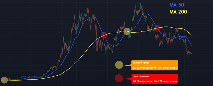 📍 Самые распространенные ситуации — «золотой» крест и «мертвый» крест.