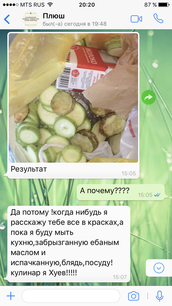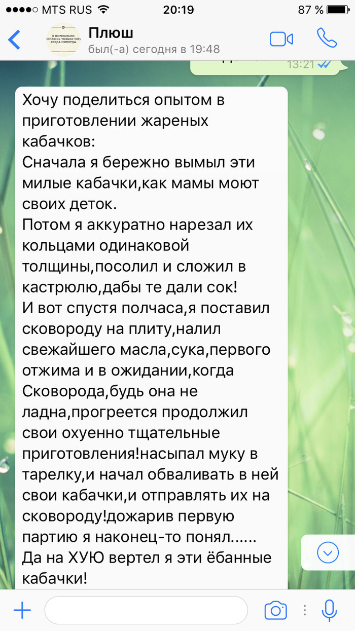 5 Inzim23 Юмор Рецепт кабачков. 8 лет назад Показать полностью 3 [моё] Кулинария Юмор СМС Длиннопост Мат