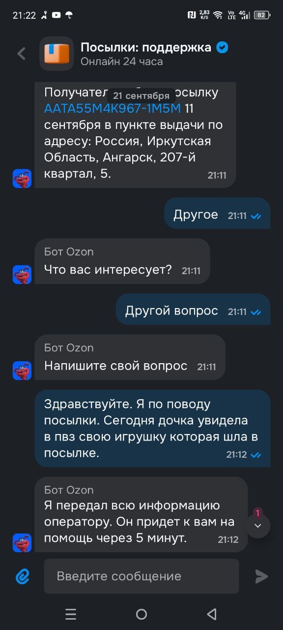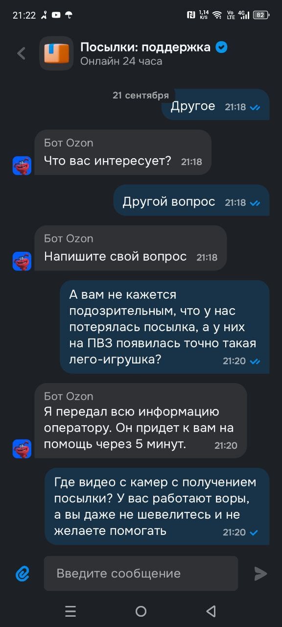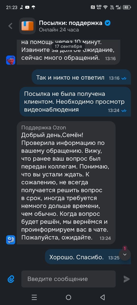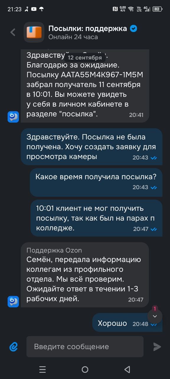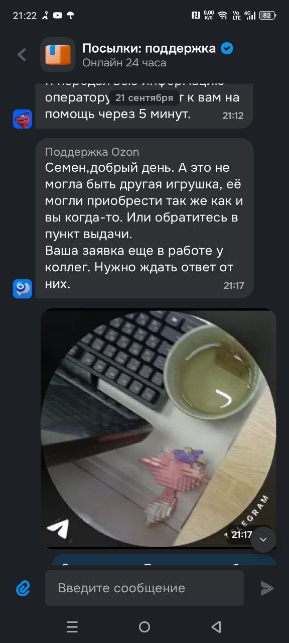 Теперь собственно история. Вторую посылку с этой лисичкой и некоторыми другими игрушками она не получила. С ее слов, она получила уведомление вечером, а на следующий день уже ничего в приложении не было. Она пришла в ПВЗ по адресу 207 квартал 5, объяснила им ситуацию, что вчера посылка пришла, а сегодня штрихкода уже нет. Девушки пообещали ее поискать. Ничего они не нашли. Муж и дочь стали писать в поддержку. Им ответили, что посылка была получена утром, когда дочь была в колледже. Муж затребовал видео с камер. В поддержке пообещали разобраться в ситуации в течение трех дней. И пропали.