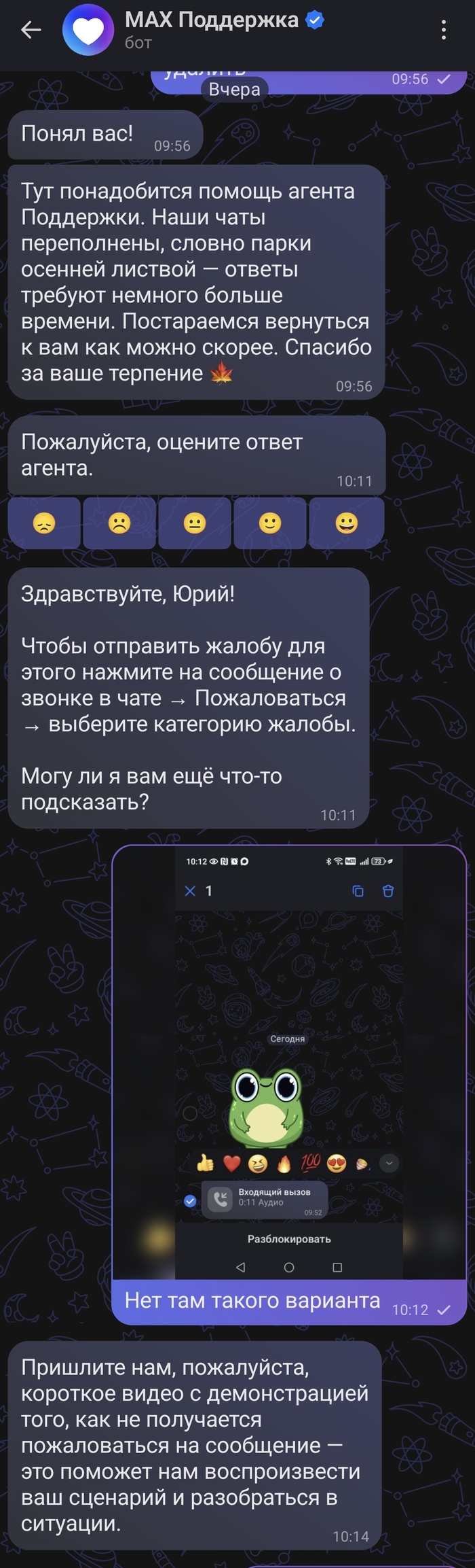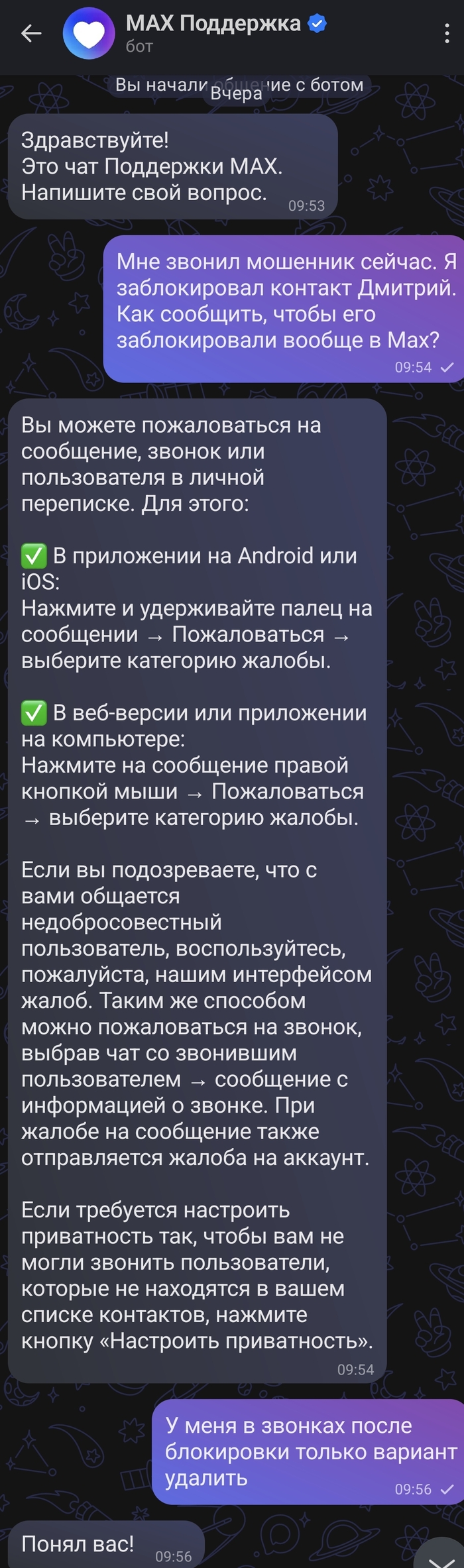 Вчера звонок в MAX от неизвестного контакта Дмитрий. Есть у меня знакомый такой - ответил. Представляется службой обслуживания домофонов, дальше не слушал сбросил и заблокировал у MAX. При этом хотел отправить жалобу на мошенничество, а кнопки такой в android не нашел. Написал в поддержку и дальше чат с поддержкой: