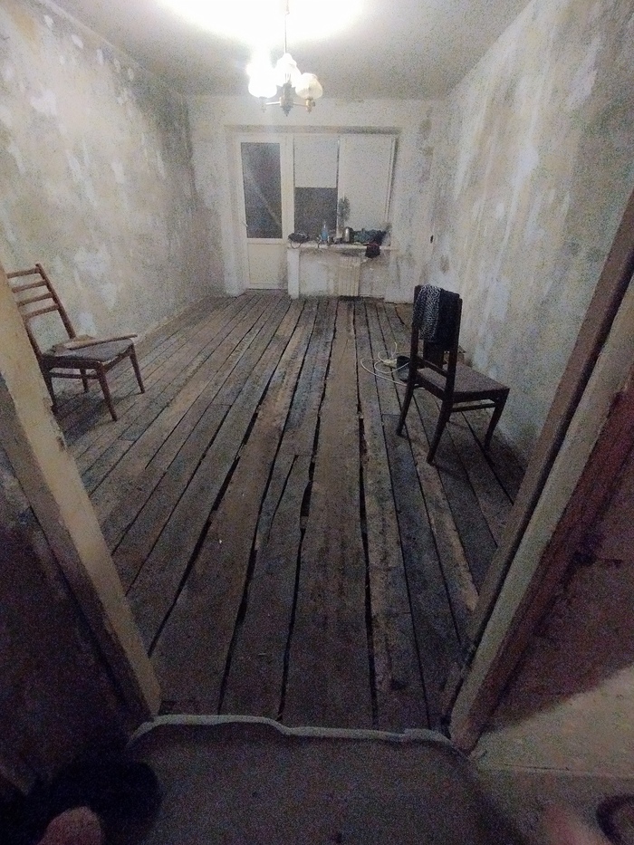 Полы- сейчас деревянные доски и убитый паркет, которому 50 + лет, снимаем, заливаем стяжку. Наверх в зале ламинат, в остальной квартире плитку.