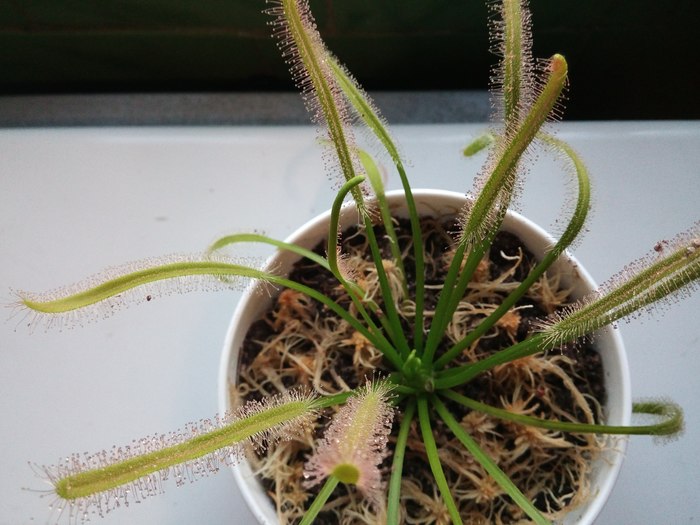 Кстати, последнее кормление должно быть не позже середины сентября! По соседству с ней - одна из самых быстрых росянок в мире - drosera sessilifolia. Мухоловка росла все лето зелёным огурцом, и только с приходом осени начали краснеть ловушки.