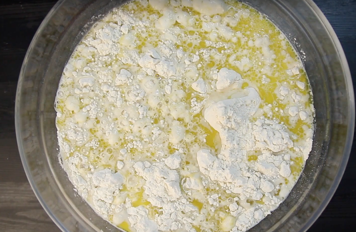 Далее добавляем растопленное сливочное масло и перемешиваем. Ту да же всыпаем муку с разрыхлителем и перемешиваем до однородной массы, далее добавляем разбухший изюм (сливаем оставшийся сок апельсина, он нам не нужен). Перемешиваем чтобы изюм равномерно распределился в тесте.