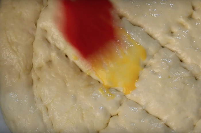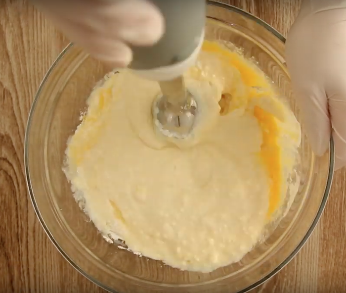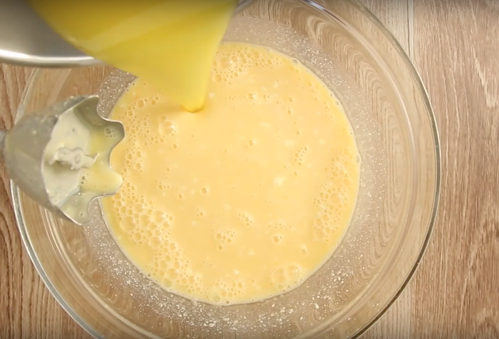Изюм заливаем апельсиновым соком и оставляем набухать. Тесто: взбиваем яйца с сахаром и ванилью, добавляем творог и цедру и доводим до однородной массы погружным блендером или же творог можно заранее перетереть через сито.