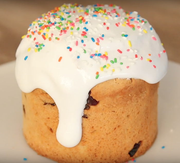 Для глазури взбиваем 1 яичный белок с 160 граммами сахарной пудры до пышной пены и покрываем шапочки готовых куличей, украшаем по своему вкусу.