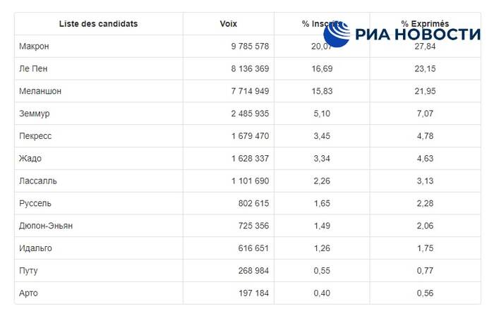 Во второй тур проходят Эммануэль Макрон (27,84%) и Марин Ле Пен (23,15%).