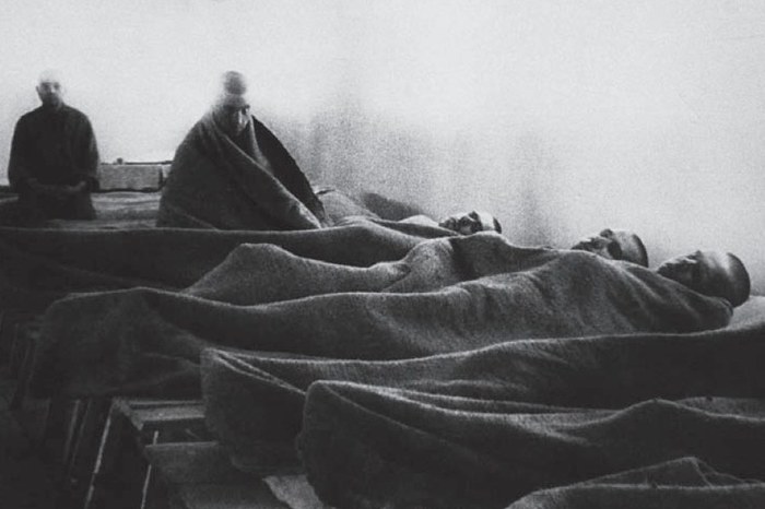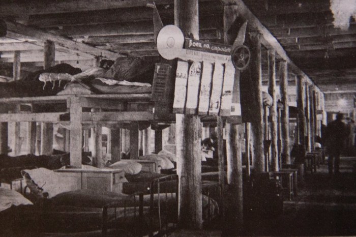 На фото- типовой барак для заключенных системы ГУЛАГа. Но из-за перенаселения в Безымянлаге всё выглядело намного хуже- заключенным отводилась в бараке даже не "гулаговская" норма в 2 кв. м на человека, а 1 кв.м, а иногда и 0,7. Многие заключенные спали на голых досках, матрасы с соломой считались роскошью, бараки были наполнены клопами и вшами.