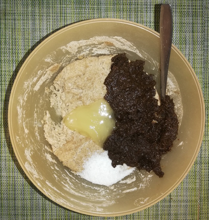 Столовую ложку опары убираем в холодильник, она нам послужит закваской в следующий раз. Остальную опару смешиваем с заваркой, медом и солью. Неаппетитная темно-коричневая каша справа на фото - как раз заварка.