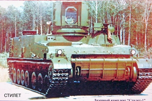 Первым был автономный комплекс специального 1К11 «Стилет». Комплекс разработан во второй половине 1970-х, предназначался для противодействия оптико-электронным средствам наземной техники: на дальности до 3000 метров днем и 1200 метров ночью. Скорострельность, если так можно выразиться, составляла 1 импульс в 15 секунд. После 20 импульсов подряд требовалось 15 минут на охлаждение.