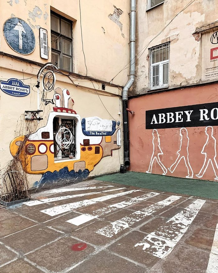 На входе во двор вас встретят барельефы с головами золотой четверки группы The Beatles. Во дворе - табличка с названием "Улица Джона Леннона", граффити и надписи, строчки из любимых песен. Из унылого двора-колодца дворик превратился в яркую и добрую историю памяти любимых музыкантов, где нередко проходят встречи фанатов и даже концерты.