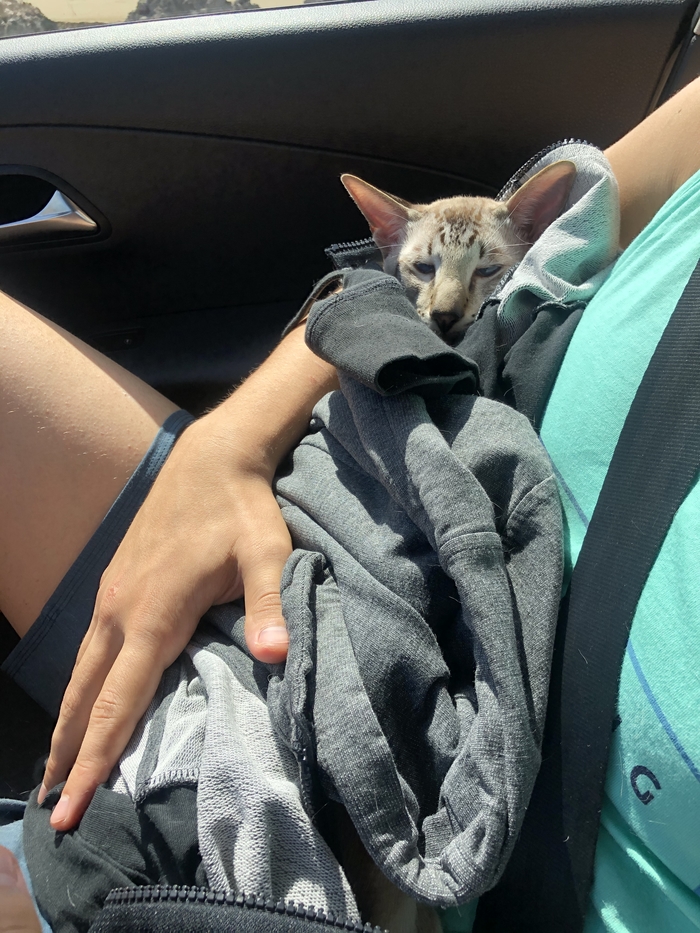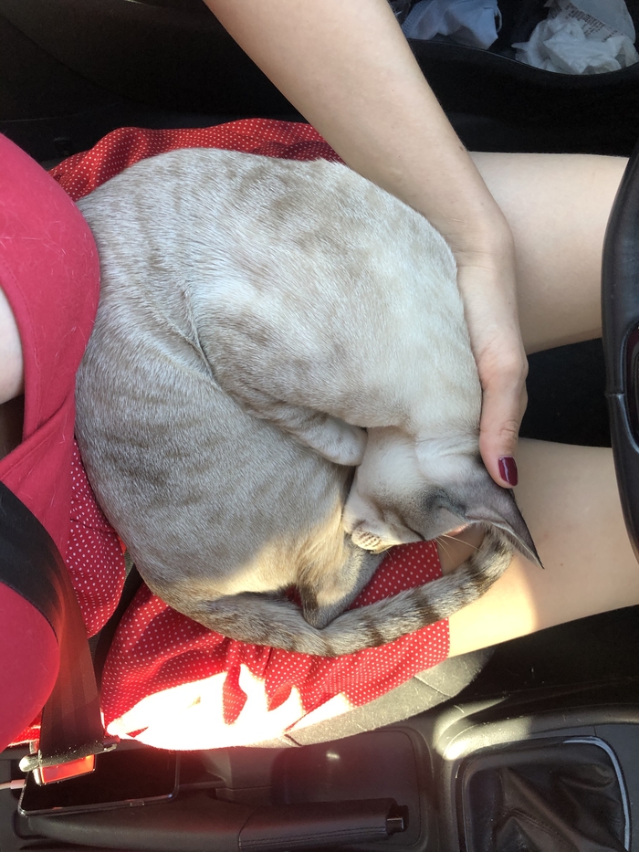 Итак, обещанный рассказ о длинной поездке с ориенталом. В целом, поездка удалась, кот всю дорогу спал на моих коленях или коленях молодого человека. В туалет попросился в лоток, кушал с нами на остановках. Единственной ошибкой было взять попутчиков в бла бла кар. Мой кот до тех пор никогда не проявлял агрессию, контактировал со всеми гостями в нашем доме и даже жил душа в душу с нашей подругой, когда мы уезжали от него на неделю. Но тут нас ждал неприятный сюрприз. Как только они сели в машину, я даже не успела до конца произнести фразу «он очень ласковый и сейчас будет с вами дружить». Он как Рысь попытался прыгнуть на заднее сиденье, шипя и раскрывая свою пасть для укуса в движении. Благо, Рома его поймал на лету. После этого до Нижнего мы ехали молча🤣 Как только попутчики вышли, кот радикально поменялся в настроении, успокоился и уже не доставлял нам никаких хлопот. В заключение скажу, что к критике о том, что перевозить животных 12 часов- это издевательство, я готова. Но мое мнение - лучше он будет спать, гулять, сидеть на заднем сидении и с нами 12 часов, чем мучать 200 пассажиров самолета. Не люблю причинять другим неудобства. Ну и пара фоточек путешественника, который в пробках на М-7 знатно повеселил дальнобойщиков, помахивая им лапкой в окно, аки Мистер Бин 🤣
