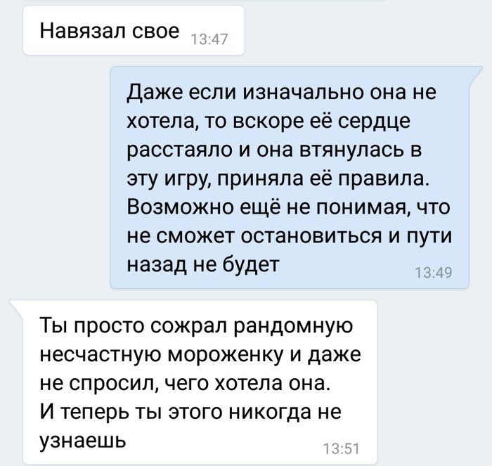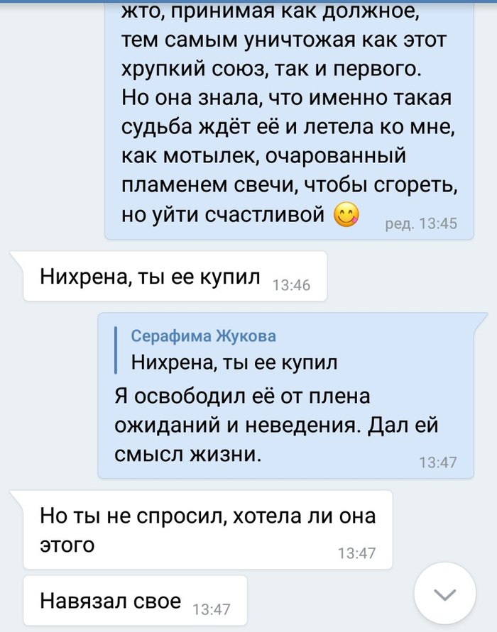 Ну да ладно. Помог, никакой благодарности, кроме «большого спасибо» я не ждал, и благополучно на это дело забил. Но прошло пол года, со своей тогдашней девушкой я расстался и в предверии своего дня рождения вывесил в контакте сообщение, что в такие-то выходные отмечаю ДР на даче, есть пара мест для желающих весело провести выходные. На это событие внезапно подписалась моя бывшая одноклассница, Настя (та, которая ушла после 9 класса). Попутно мы с ней начали общаться. Она проявила симпатию… и тогда кусочки мозаики сложились в моей голове: это ей я тогда помог! А теперь она видит, что я расстался с девушкой, я в её глазах если не рыцарь, то как минимум человек, который всегда прикроет.. короче все на мази.