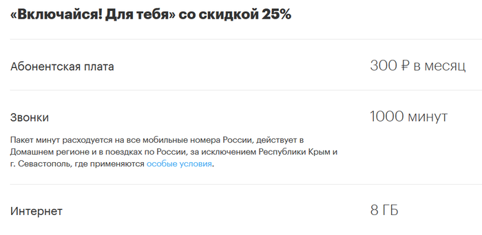 Для Москвы предлагали Включайся.пиши с 50% скидкой, но я попросил тариф Включайся. Открывай. Абонентская плата 3 р/ сутки (с учетом скидки 50%). Но здесь есть 1 подводный камень - если вдруг вы выговорите 2 000 минут, то звонки на МФ бесплатны, а на других операторов и на городские резко становятся 13р/мин. И да, интернет безлимитный с раздачей и торрентами.