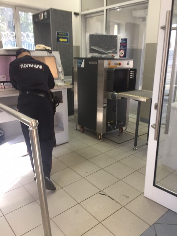 На входе стоит полицейский, рамка металлоискателя, недавно поставили везде рентгеновские аппараты как в метро и аэропортах.