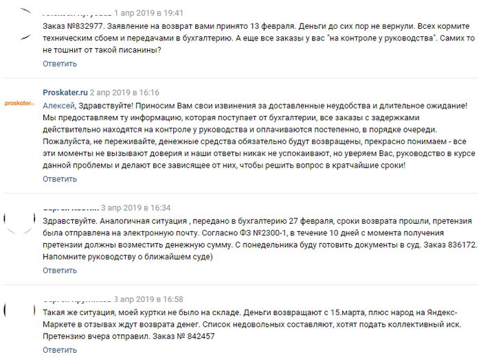 Дальнейший поиск привел в паблик в Вконтакте и в обсуждениях была очень интересная для меня тема "Возврат товара". Открыв её увидел, что я не один такой жду возврата своих денег по несколько месяцев.