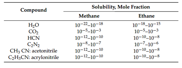 Скудный набор питательных веществ может отразиться на уровне развития форм жизни. В таблице ниже представлены легкорастворимые в метане и этане органические соединения, присутствующие на Титане.