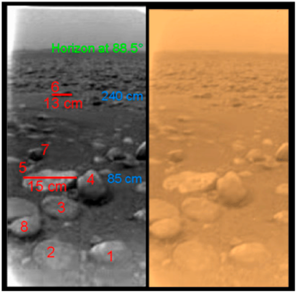 Поверхность Титана в месте посадки “Гюйгенса”, 10.2°S, 192.4°W. На изображении пронумерованы 8 видимых камней, размеры двух из них указаны рядом. Расстояние от посадочного модуля указано синим. Предполагается, что камни состоят из водяного льда, покрытого твёрдым органическим веществом. Округлая форма камней свидетельствует о воздействии на них жидкости.