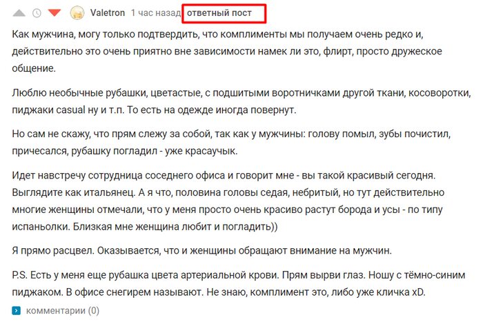 JackSparrowCap 2 года назад Ответ BerryMan29 в «Про комплименты мужикам»33 Комплимент Мужчины и женщины Мужчины Ответ на пост Текст Ещё 0
