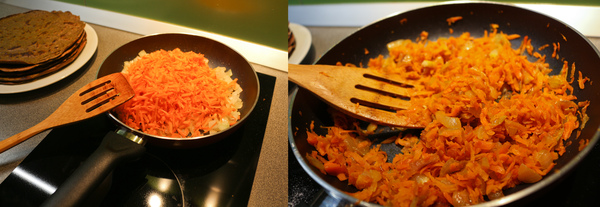 После того, как блины готовы, на новую сковородку выливаем 2 ст. ложки растительного масла и обжариваем лук до золотистого цвета, затем добавляем морковь и обжариваем на среднем огне до мягкости моркови, в конце добавляем 0,5 ч. ложки соли и еще минутку погреем на огне.