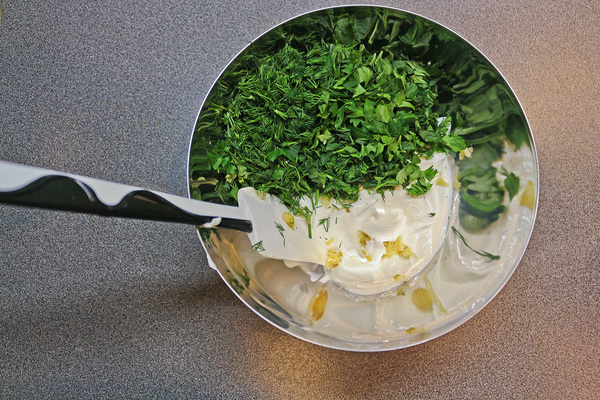 Короч в сметану добавляем измельченные зубчики чеснока, у меня их 4, и половину нарезаной зелени. Второй половиной я украсила сверху. Ну это дело вкуса.