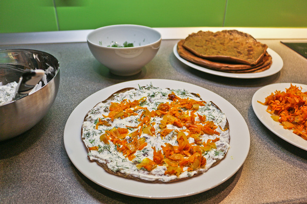Приступаем к сборке торта, берём первый и промазываем сметанным соусом, сверху морковно-луковый наполнитель и накрываем новым блином. У меня получилось 7 блинов, чтобы рассчитать начинку визуально делим ее на количество блинов и всё будет ок.
