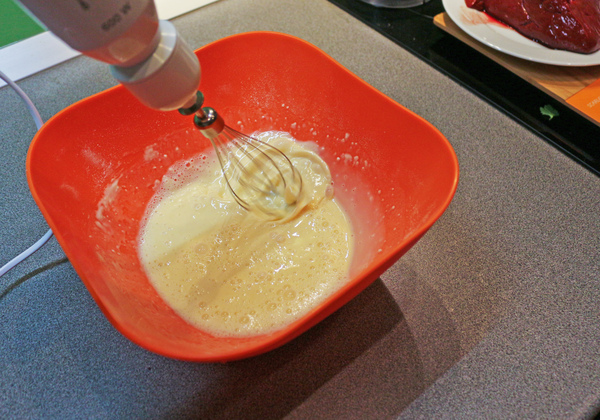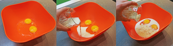 Разбиваем в миску 2 яйца, добавляем 100 мл. молока и 50 гр муки.