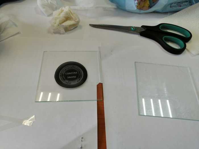 - Берем кусочек глянцевой бумаги, смачиваем его водой и приклеиваем (за счет напряжения воды) к стеклу (в идеале оргстекло, я юзаю обычное 10х10 см 3 мм);