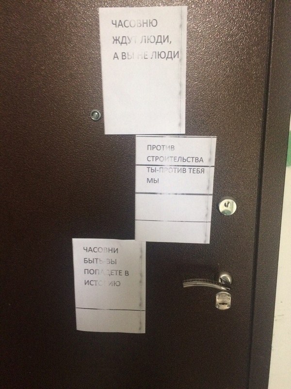 «Дверь моей квартиры обклеили листовками с угрозами 12 мая. На них было написано, например, что раз я против строительства часовни, то кто-то против меня. За день до этого мне писали «ВКонтакте», что испортят мою жизнь, а на следующий день, примерно в 8.00 я вышла из квартиры и увидела эти листовки на двери, — рассказала Валерия Зайкова ТВ2. — Я не думаю, что это делали взрослые люди. В сообщениях были ошибки, а сам поступок для взрослого адекватного человека странный».