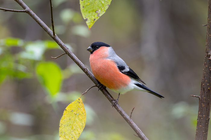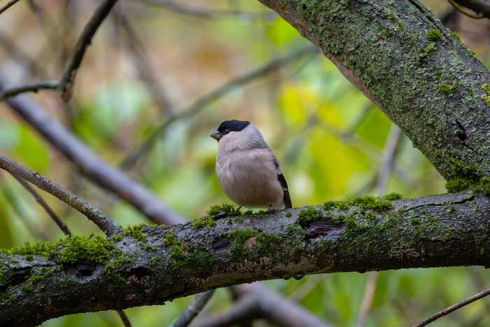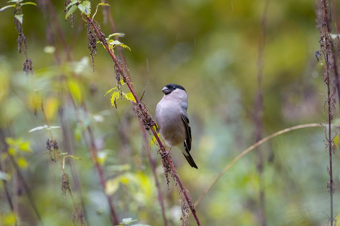 Снегирь. Не смотря на дождь снегири носятся по крапиве и объедают ее ) В этот раз самка долго в кадре мелькала